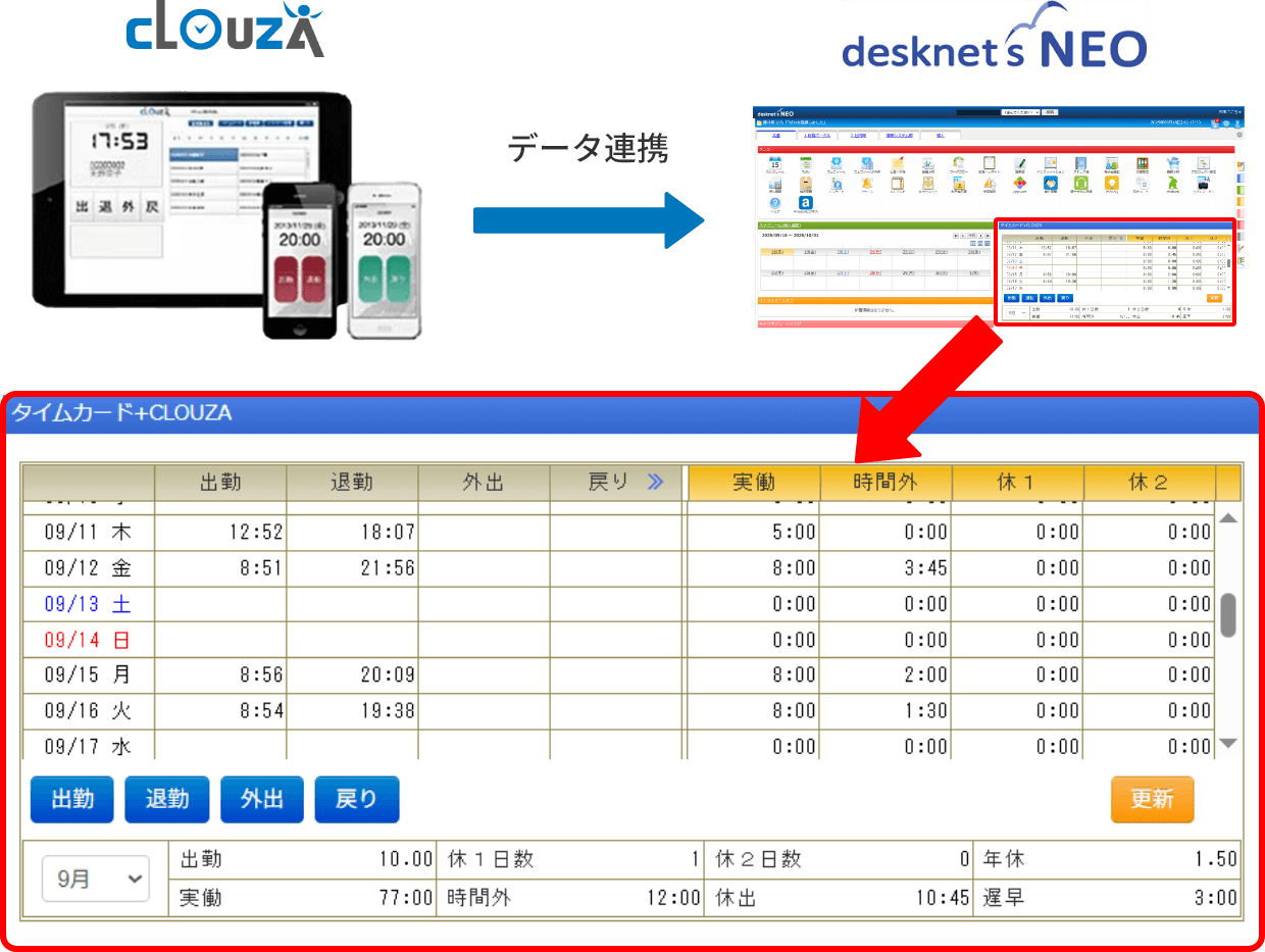 CLOUZAには、IDとパスワードを入力すればどのデバイスからでも利用できる「個人用Webタイムレコーダー」があり、従業員はここにログインすることで自身の勤務状況や残業時間などを確認できました。さらに、当社にとって魅力的だったのは、CLOUZAはグループウェア「desknet’s NEO」との連携機能があり、desknet’s NEOでも同じように個人が勤務状況や残業時間を確認することができました。