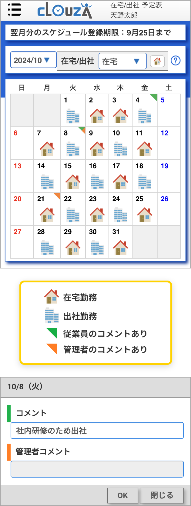 従業員は個人用Webタイムレコーダーから、管理者はCLOUZA管理画面から、在宅/出社予定の登録と確認ができます。