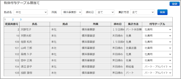 従業員ごとに有休付与テーブルを割り当てられるので、たとえば社員は勤続年数で付与、パート・アルバイトは労働日数で付与するなど、付与方法が異なる場合でも簡単に設定できます。付与するタイミングは、入社日基準、一斉付与の両方に対応しています。